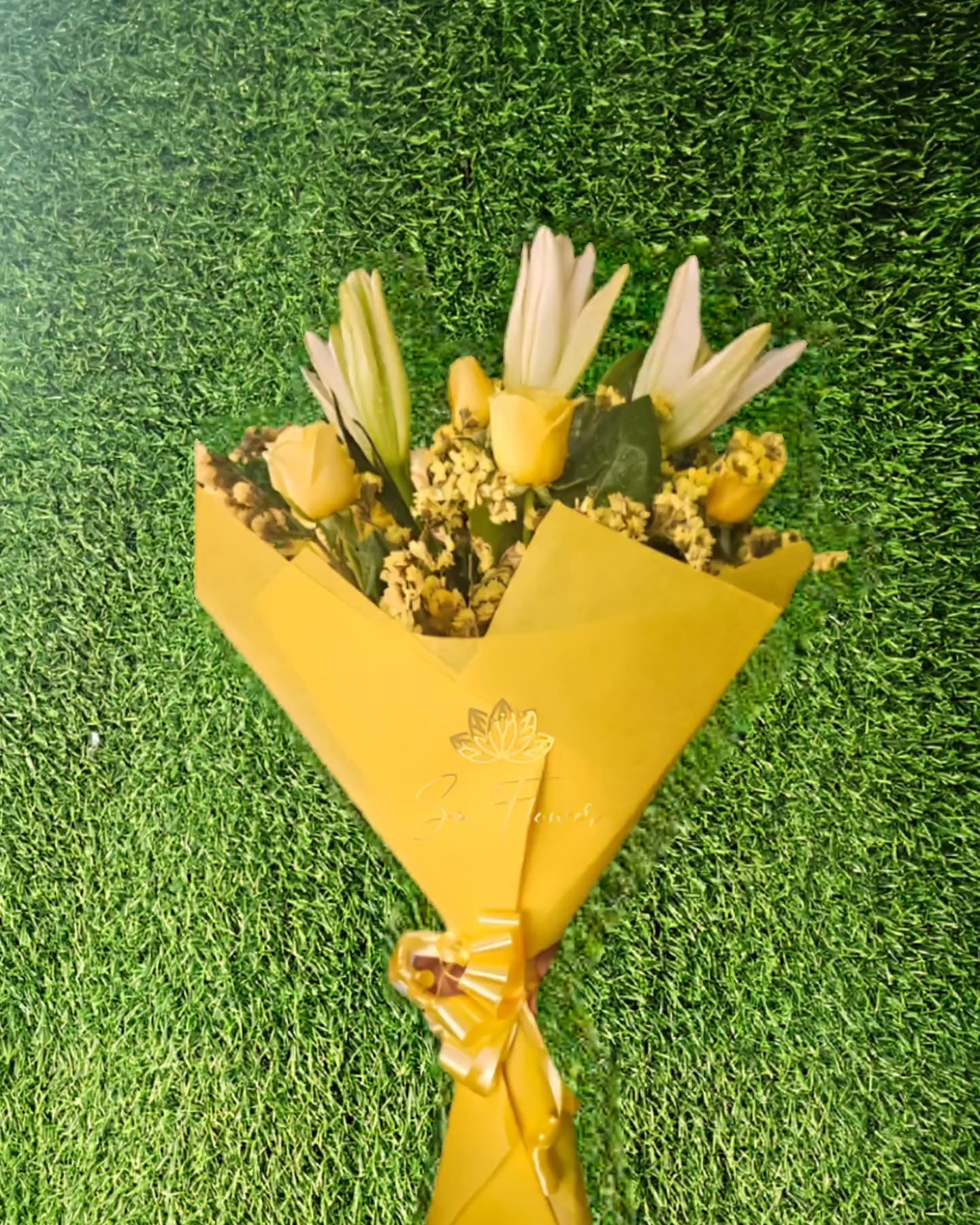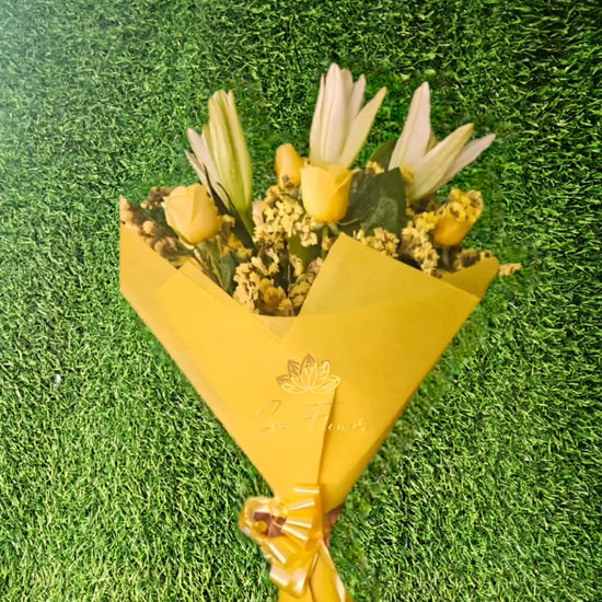 Brighten someone’s day with this handcrafted bouquet of fresh yellow roses and white lilies, wrapped in elegant yellow paper and tied with a matching satin ribbon. Perfect for celebrating friendship, success, or simply spreading happiness, this bouquet radiates warmth and positivity.
